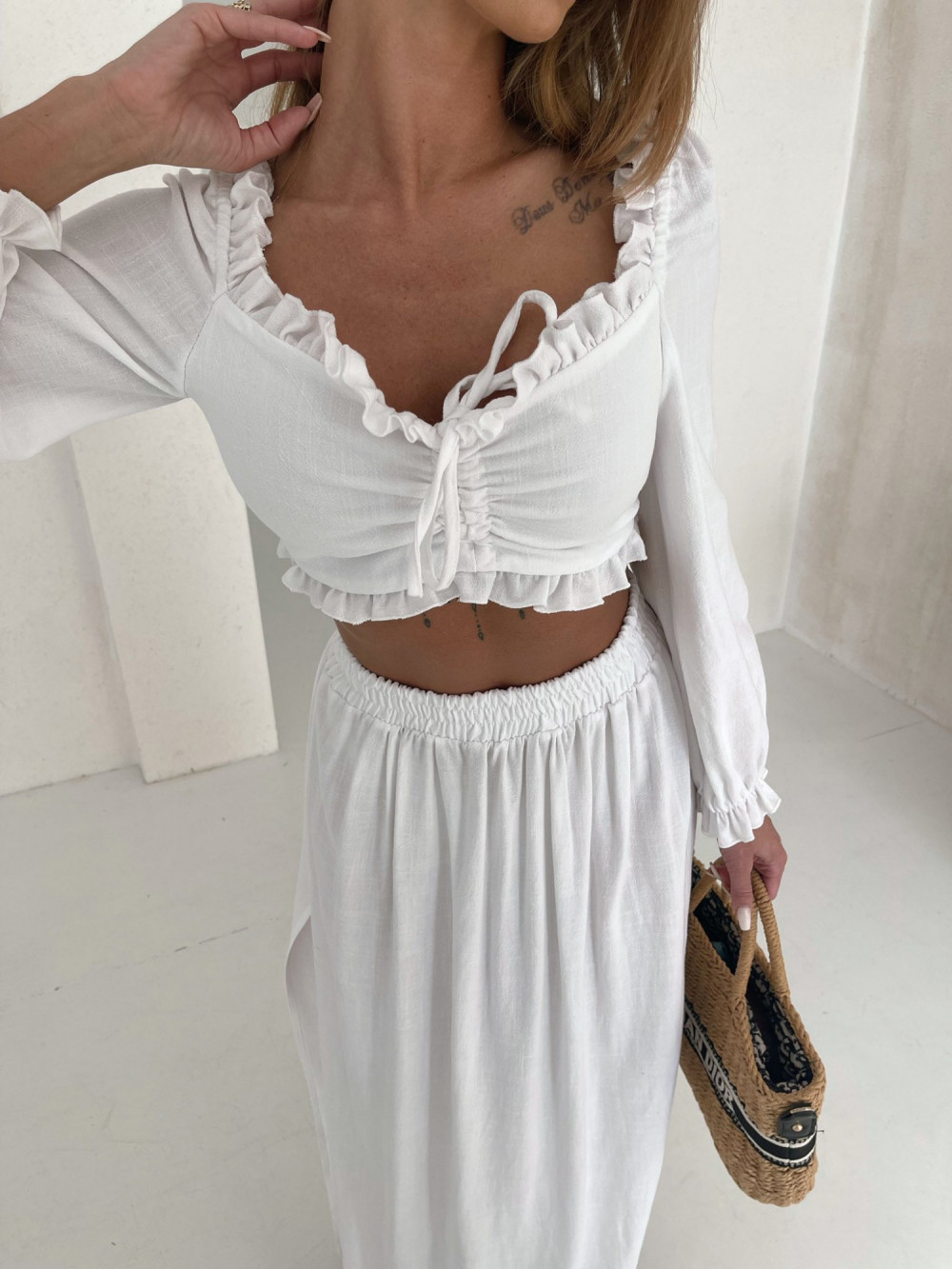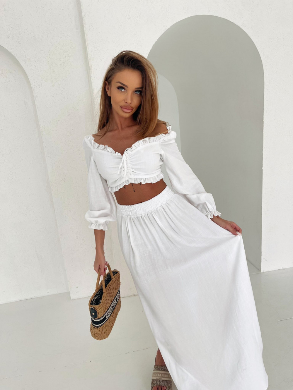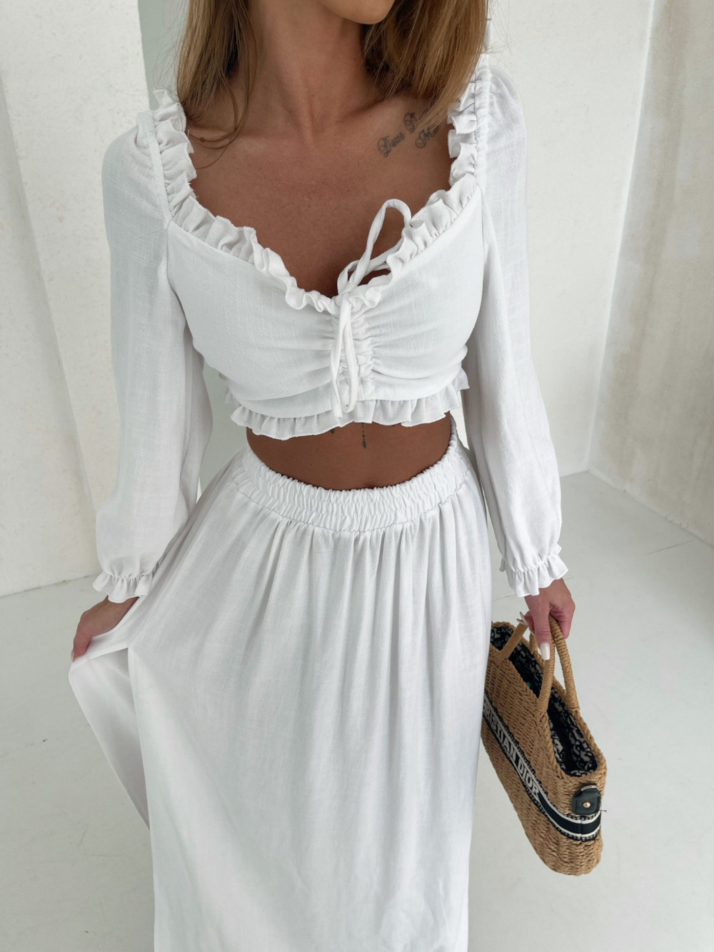 Przepiękny, letni komplet wykonany w 100% z lnu to idealna propozycja na ciepłe dni. Naturalny materiał zapewnia przewiewność i komfort noszenia, a całość prezentuje się lekko, kobieco i bardzo stylowo.