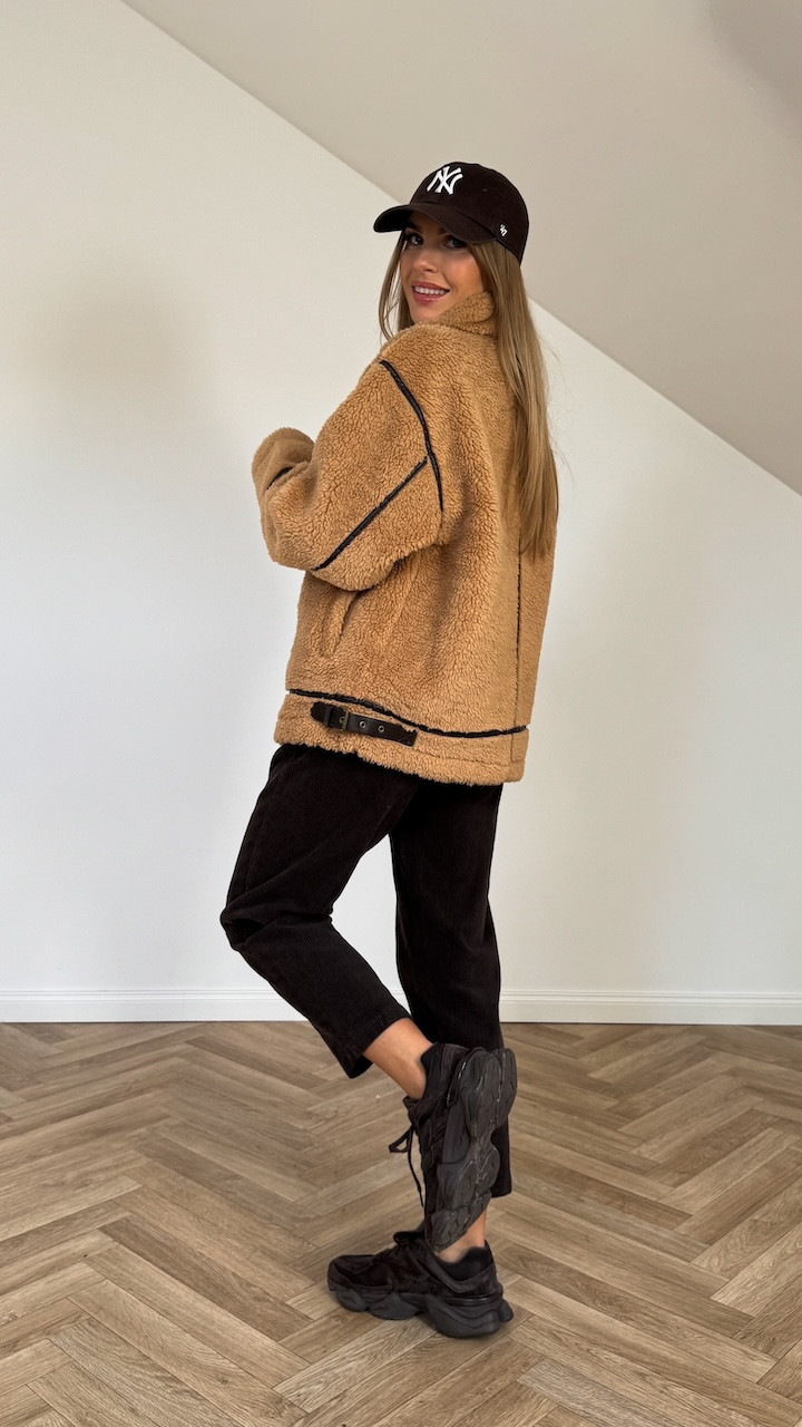 Mięciutki polar w kolorze ciepłego beżu to połączenie wygody, stylu i przyjemności noszenia. Model posiada kołnierz zapinany na zamek oraz pasek z ekoskórki, który stanowi efektowne wykończenie i dodaje całości elegancji.
