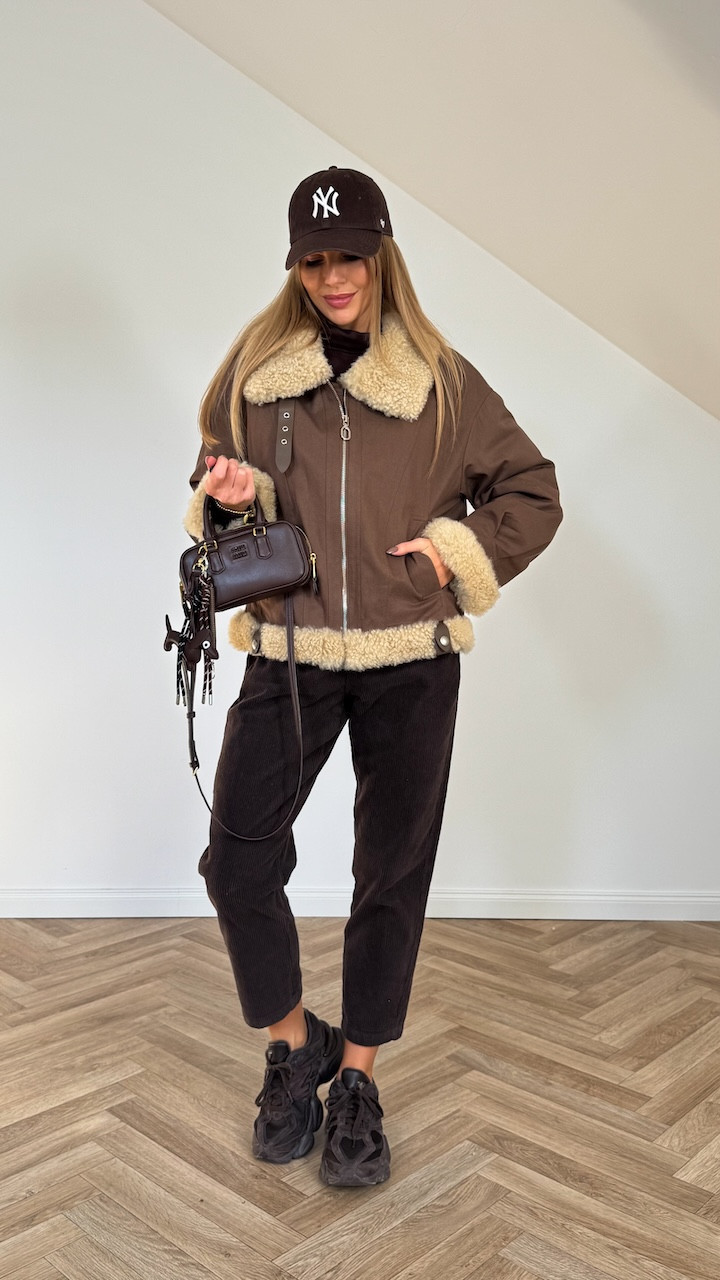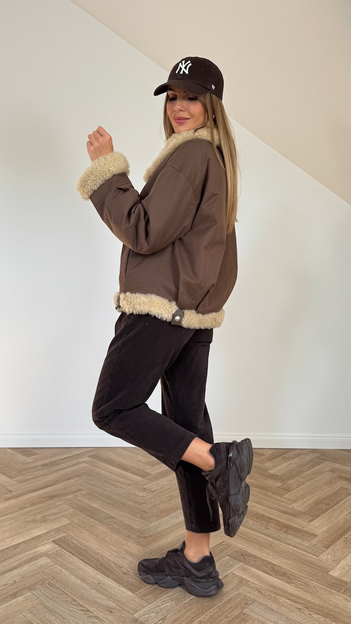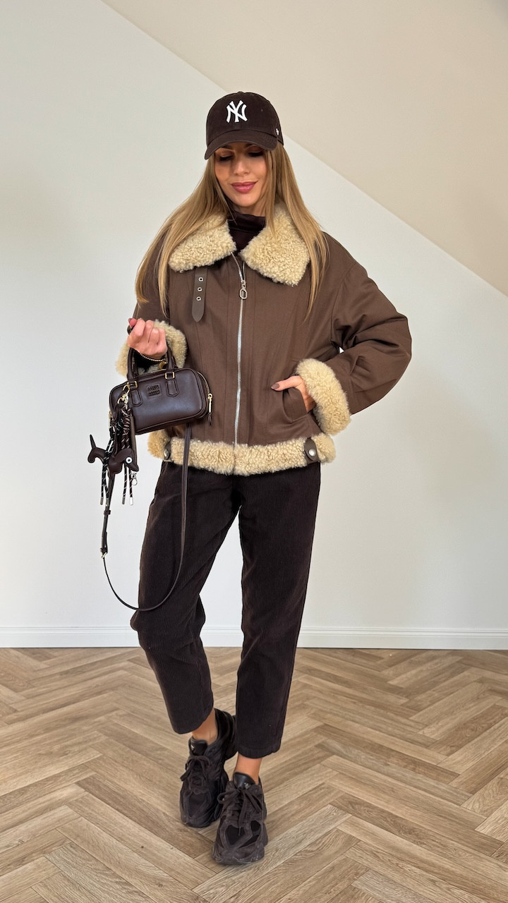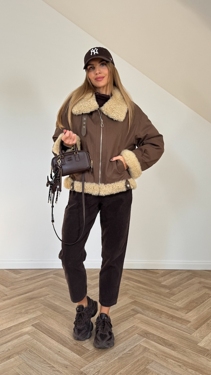 Posiada podszewkę, a futerko z wełny owczej znajduje się na kołnierzu, rękawach oraz dole kurtki, dodając jej przytulnego charakteru i eleganckiego wykończenia.