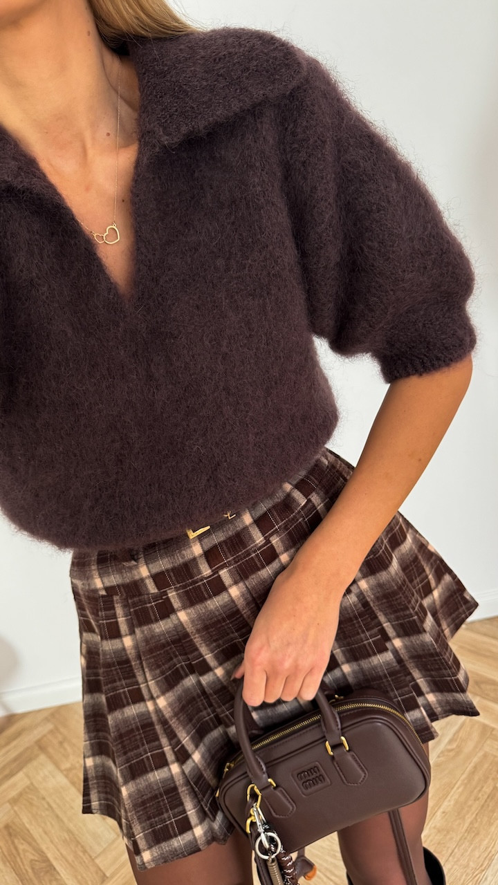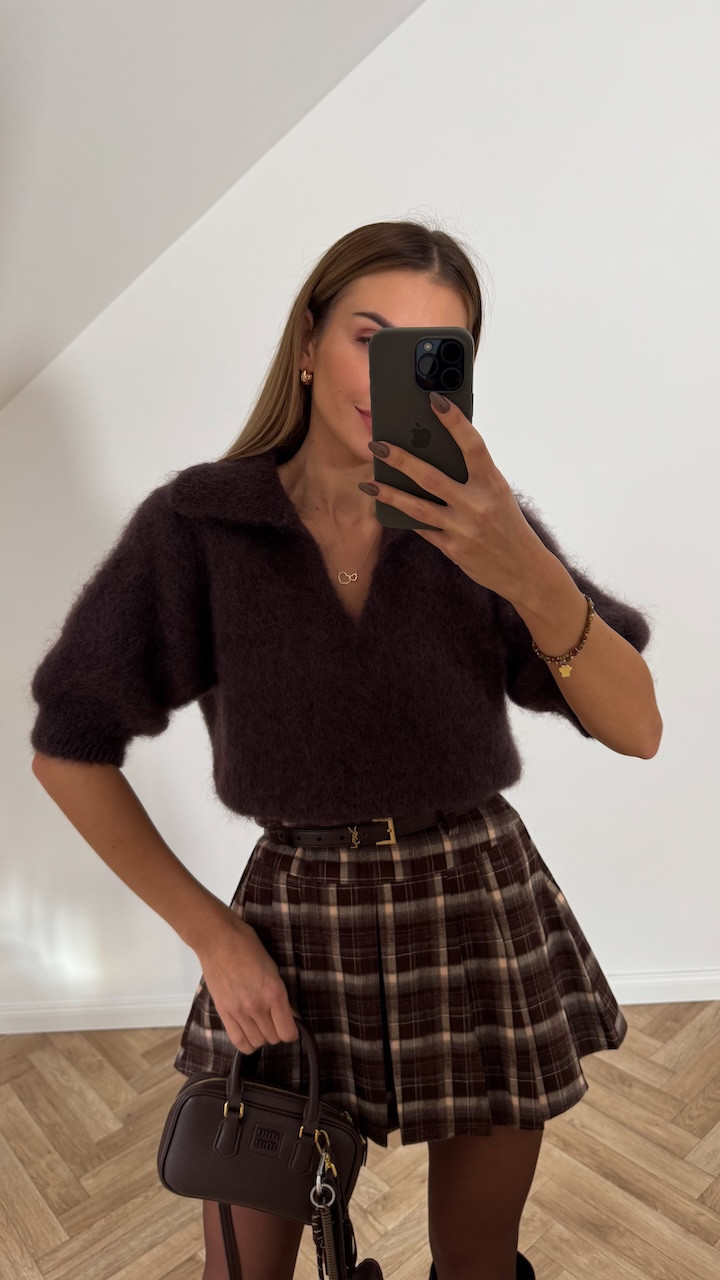 Sweterek z kołnierzykiem typu polo wykonany z luksusowej przędzy z dodatkiem kid moheru. Miękki, lekki i niezwykle przyjemny w dotyku, a przy tym bardzo ciepły. Model o swobodnym, kobiecym kroju, z rękawem typu bufka, zakończonym ściągaczem, który dodaje całości subtelnego efektu. Idealny do stylizacji zarówno eleganckich, jak i codziennych – świetnie wygląda w połączeniu z jeansami lub spódnicą.