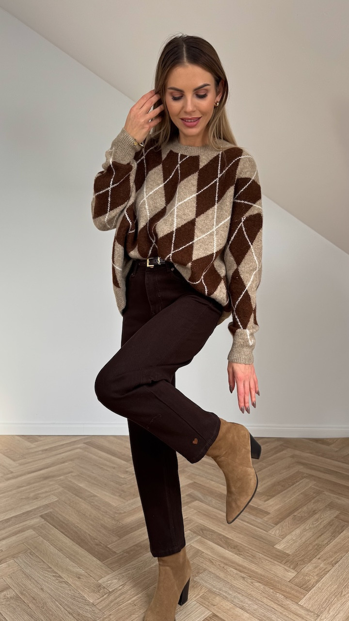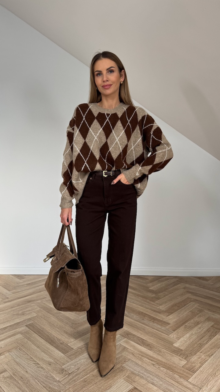 Urocze spodnie jeansowe typu MomFit w kolorze czekoladowym. Wysoki stan i klasyczny krój sprawiają, że pięknie podkreślają sylwetkę, a elastyczny materiał zapewnia wygodę w noszeniu. Na jednej z nogawek znajduje się delikatnie haftowane serduszko, które dodaje całości subtelnego uroku i wyjątkowego charakteru.