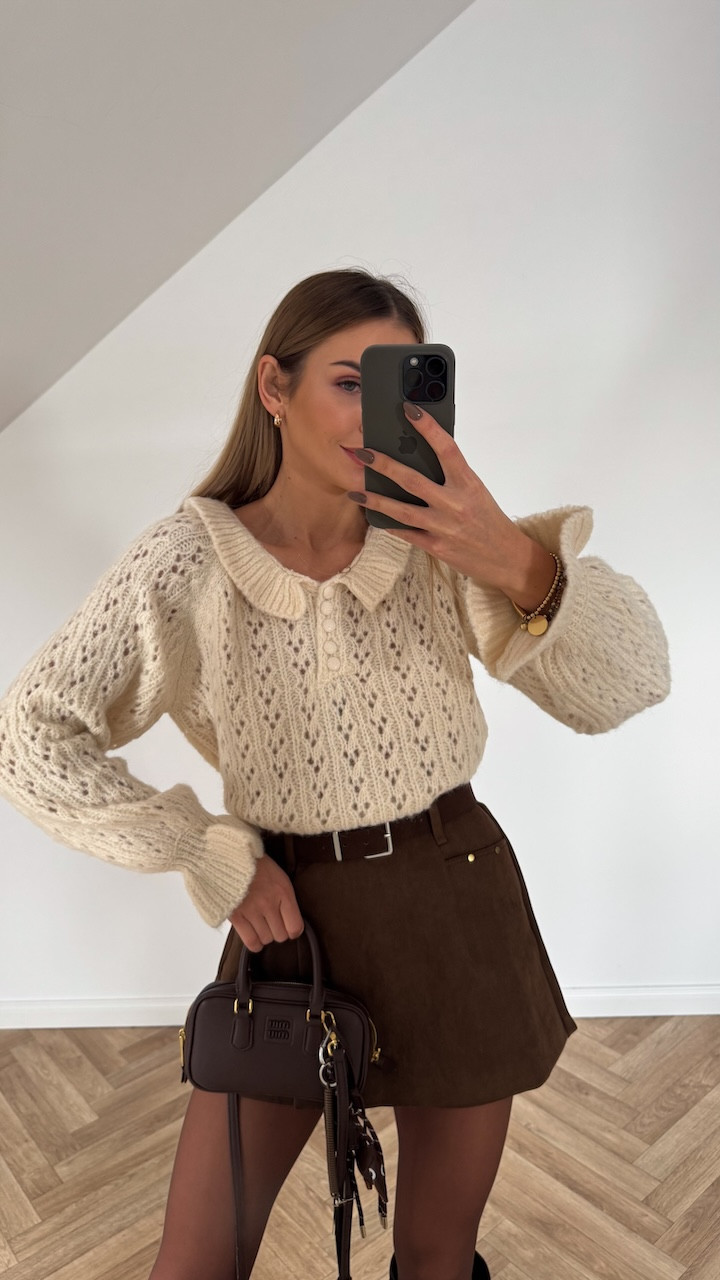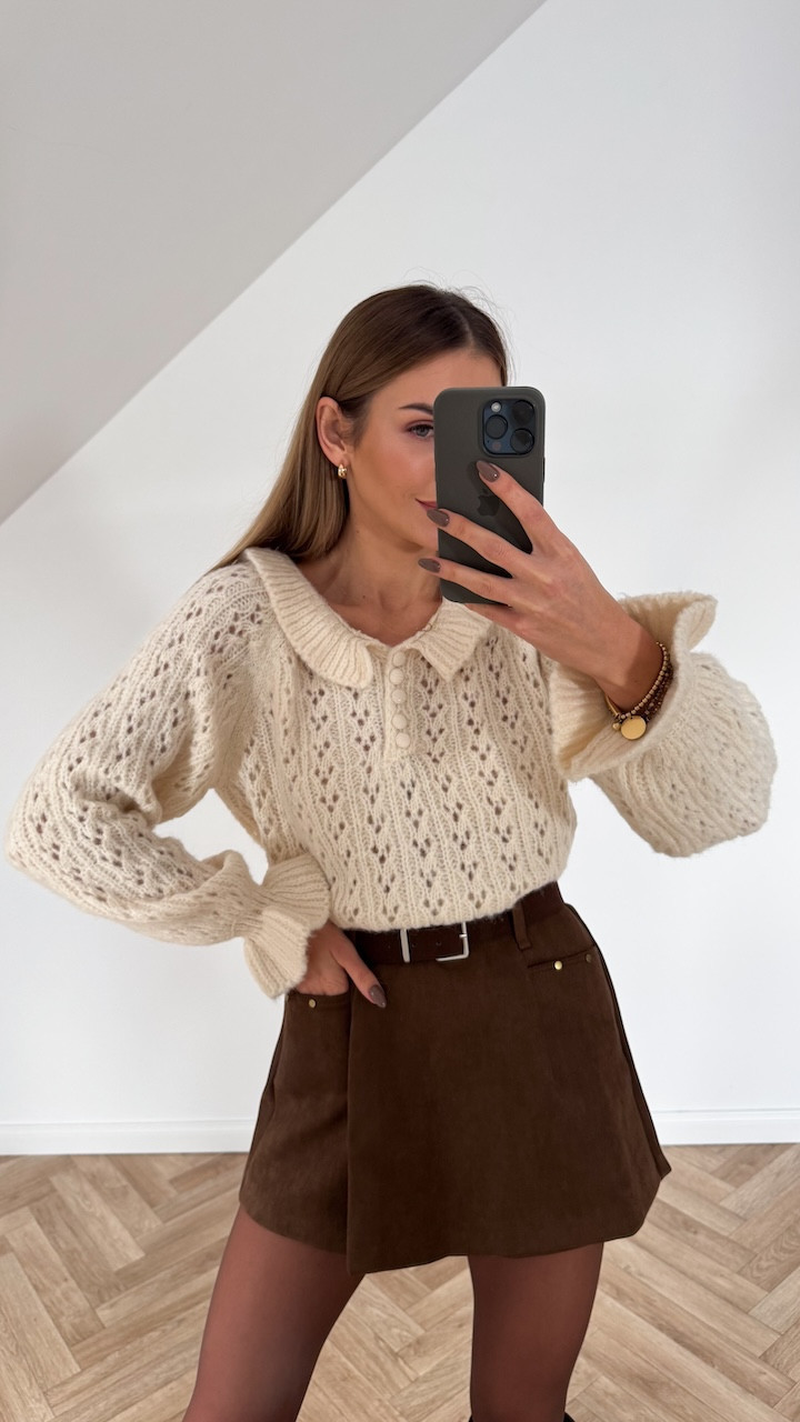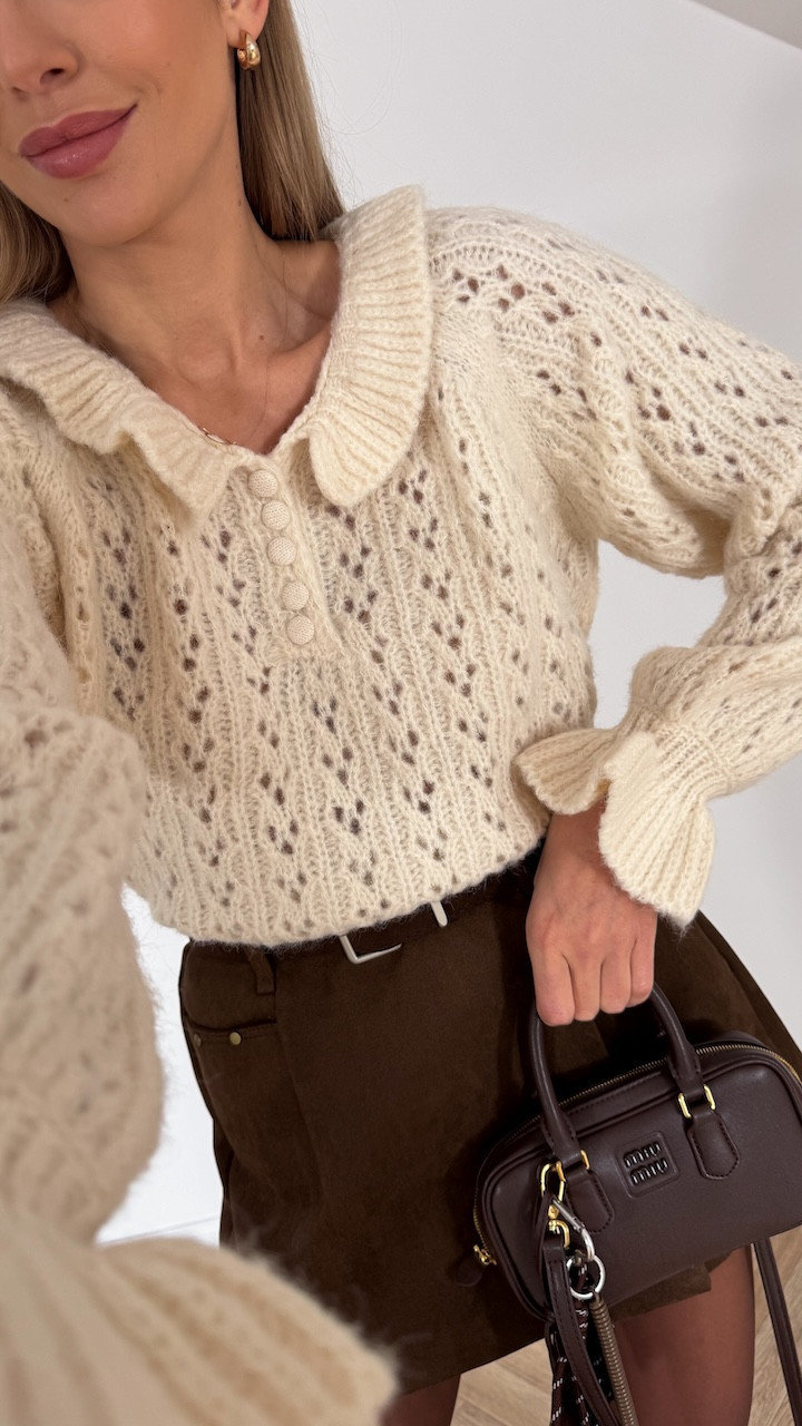 Model ażurowego swetra w stylu vintage, o uroczym i romantycznym charakterze. Posiada elegancki kołnierzyk w formie stójki oraz dekolt zapinany na guziczki, co dodaje mu klasy i subtelności. Sweter wykonany z miękkiego, przyjemnego w dotyku materiału — idealny na co dzień, jak i do bardziej eleganckich stylizacji.