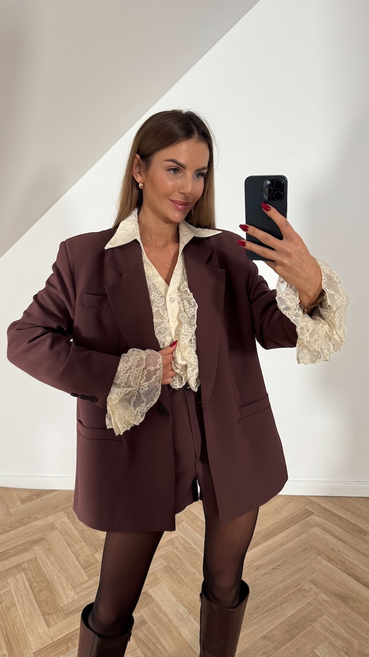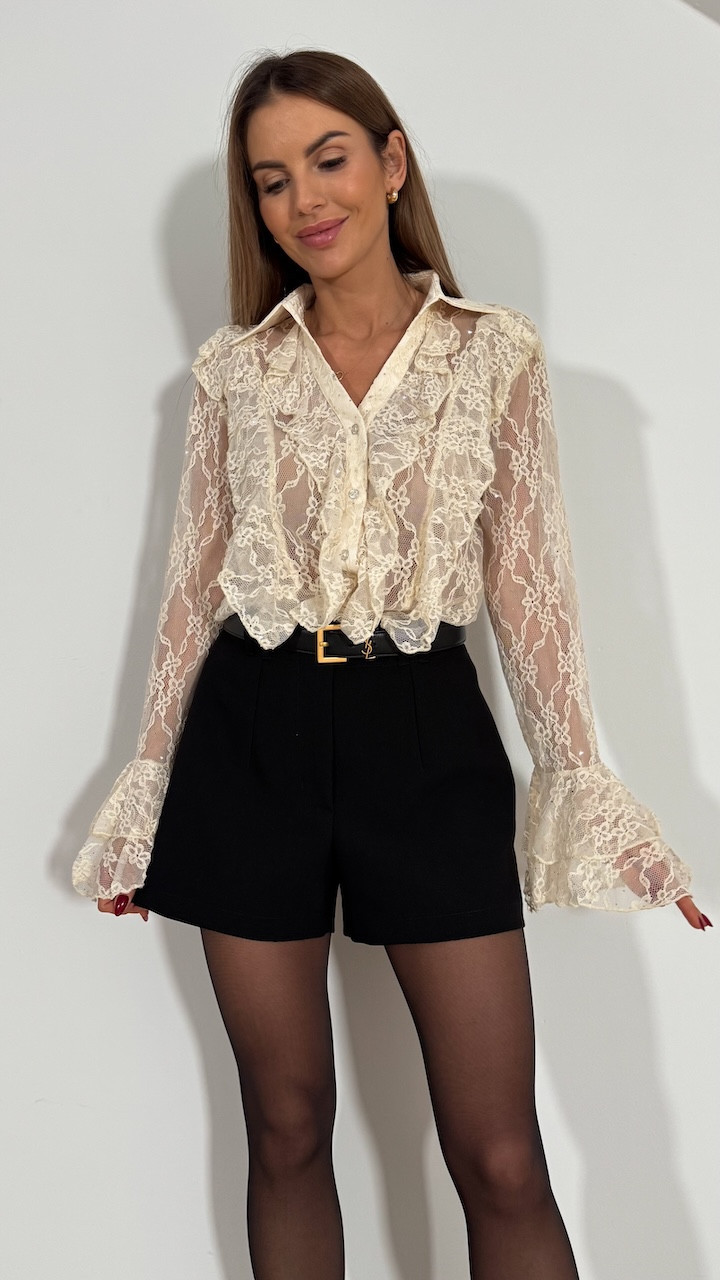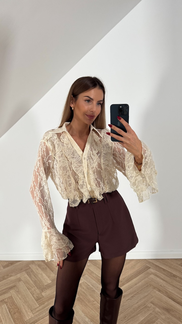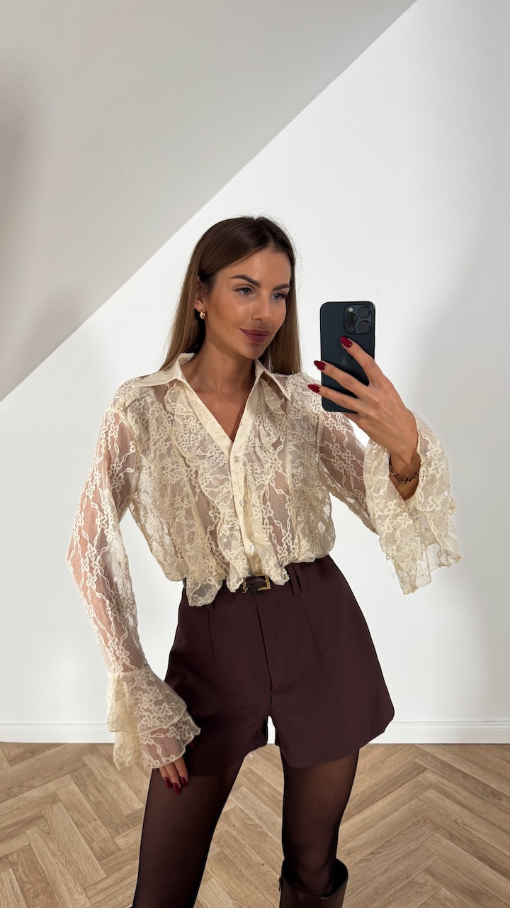 Model transparentnej koszuli koronkowej o niezwykle kobiecym i eleganckim charakterze. Wykonana z delikatnej koronki, zachwyca falbankami na całej powierzchni, które dodają jej lekkości i romantycznego uroku. Koszula jest zapinana na biżuteryjne guziki, które stanowią subtelny, ozdobny akcent. Przy szyi znajduje się kołnierzyk z falbankowym wykończeniem, a rękawy w stylu dzwonka zakończone są efektownymi falbanami, co pięknie podkreśla styl vintage i elegancję modelu.