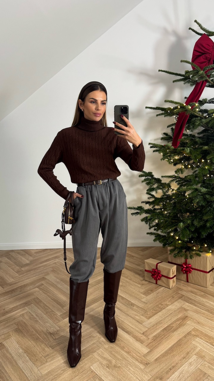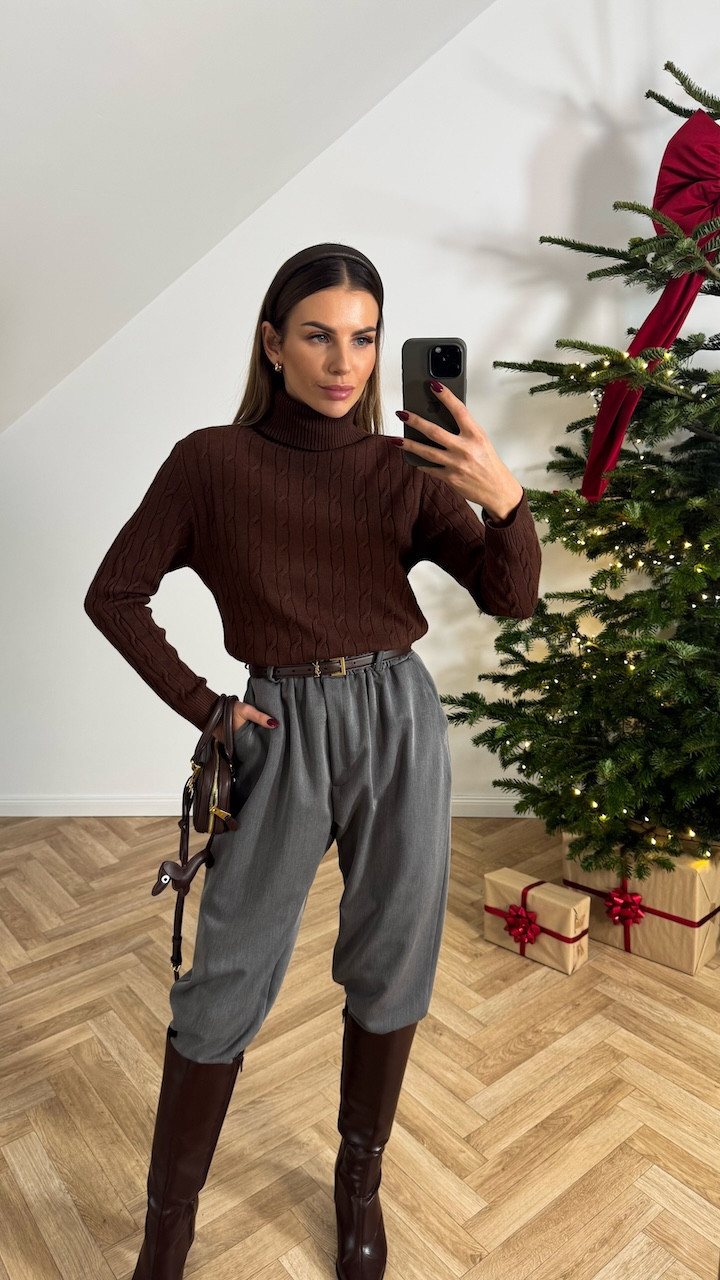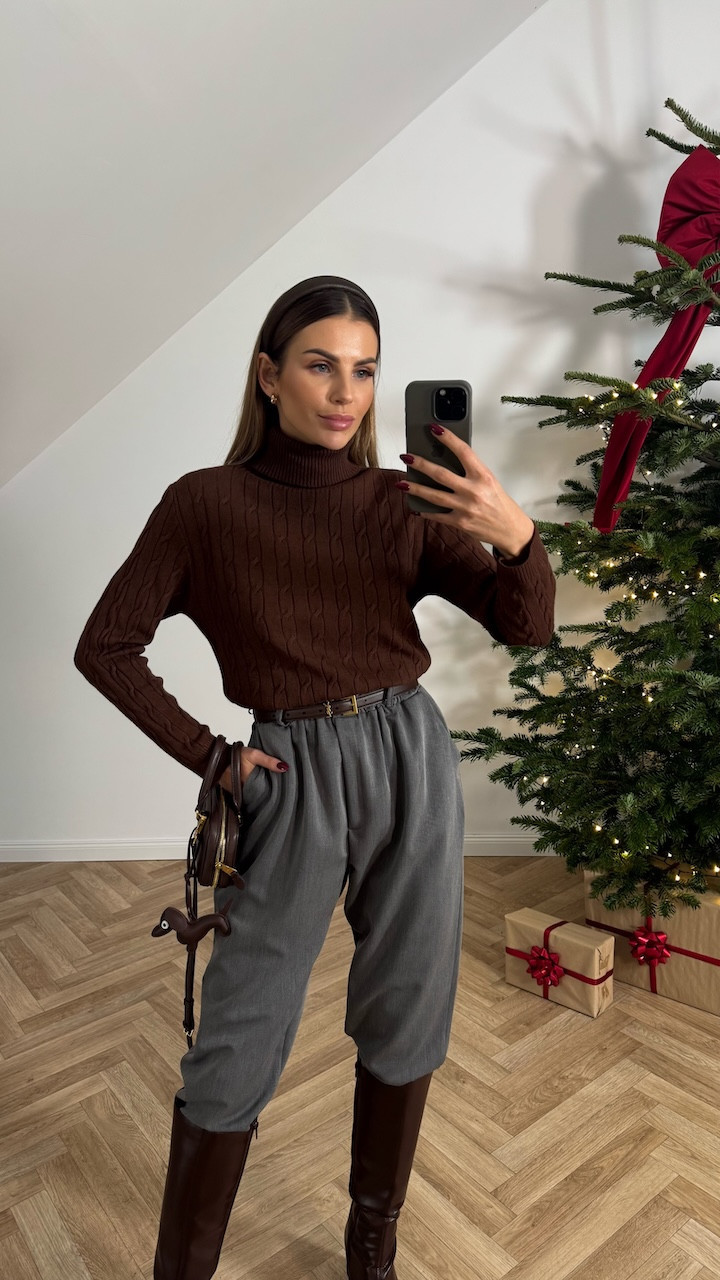 Model swetra w delikatny, warkoczowy splot wykonany z miękkiej, przyjemnej w dotyku dzianiny. Sweter posiada golf, który pięknie układa się przy szyi i dodaje całości elegancji oraz przytulnego charakteru. Fason jest klasyczny, idealny zarówno do stylizacji codziennych, jak i bardziej eleganckich. Subtelny warkoczowy splot nadaje mu wyjątkowego uroku.