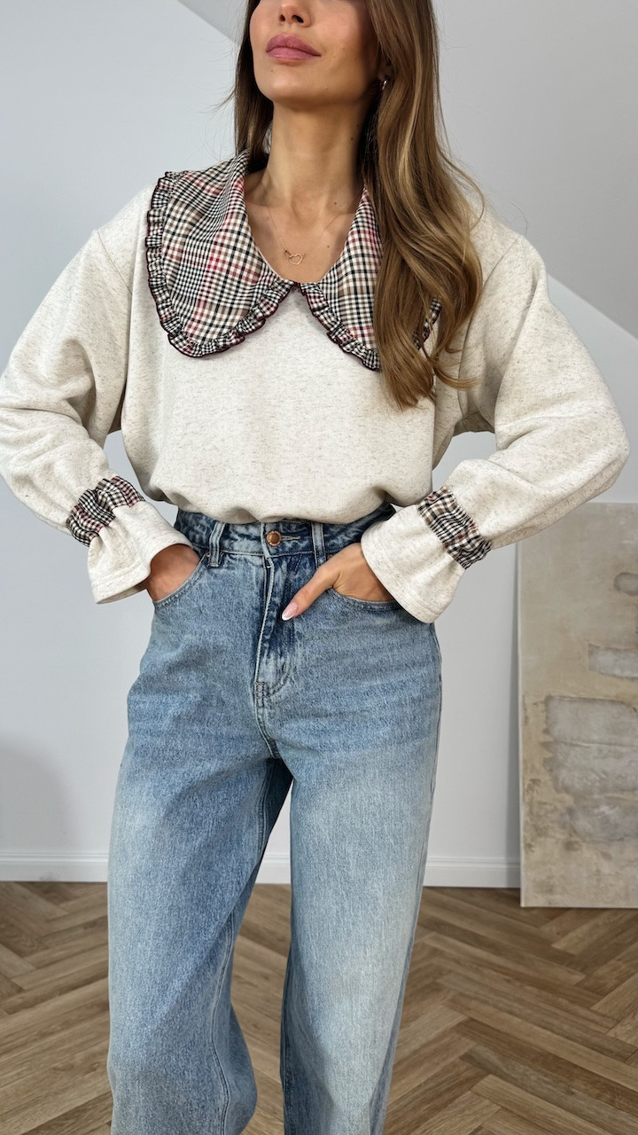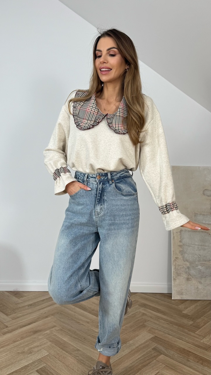 Stylowa bluza polskiej produkcji, która wyróżnia się charakterystycznym kołnierzem w stylu vintage – dodaje on całości niepowtarzalnego, lekko retro wyglądu. Model posiada bufiasty rękaw, zakończony wygodną gumką, co nadaje bluzie kobiecego kształtu i modnego wykończenia.