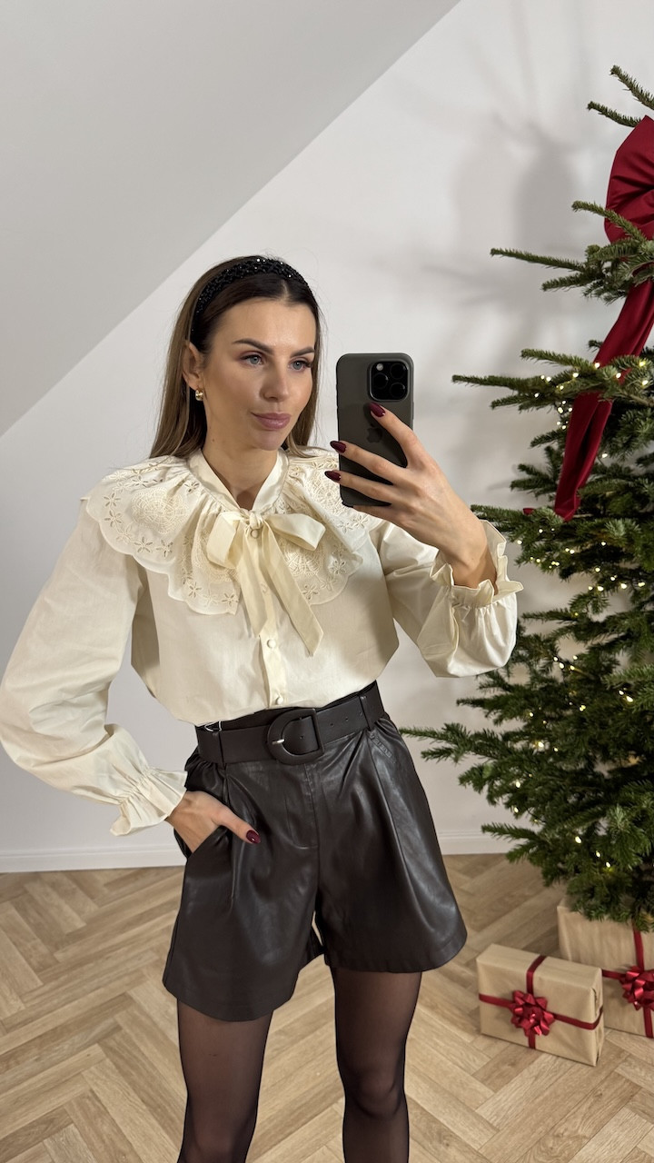 Stylowe shorty z ekoskóry o kroju z poszerzaną, luźną nogawką, które zapewniają komfort oraz modny wygląd. Wysoki stan, gumka w pasie oraz szeroki pasek pięknie podkreślają talię. Po bokach znajdują się dwie kieszenie, co dodaje praktyczności. Idealne do wielu stylizacji — od eleganckich po casualowe.