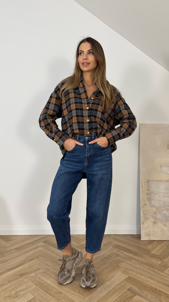 Model posiada wysoki stan, który pięknie podkreśla talię. Nogawka jest szeroka u góry, lekko balonowa, a następnie zwężana ku dołowi, co nadaje jeansom nowoczesnego, modowego charakteru i świetnie modeluje sylwetkę.