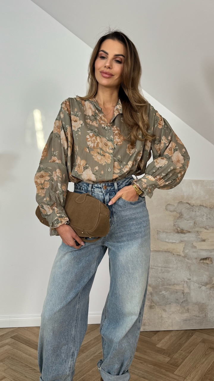 Luźny, lekko oversize’owy krój zapewnia swobodę i modny luz. Koszula zapinana jest na guziki na całej długości, a jej charakter podkreślają szerokie, bufiasty rękawy zakończone mankietem – detal, który robi efekt „wow”.