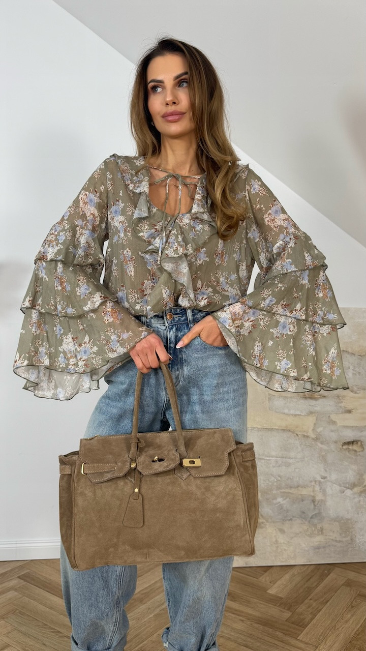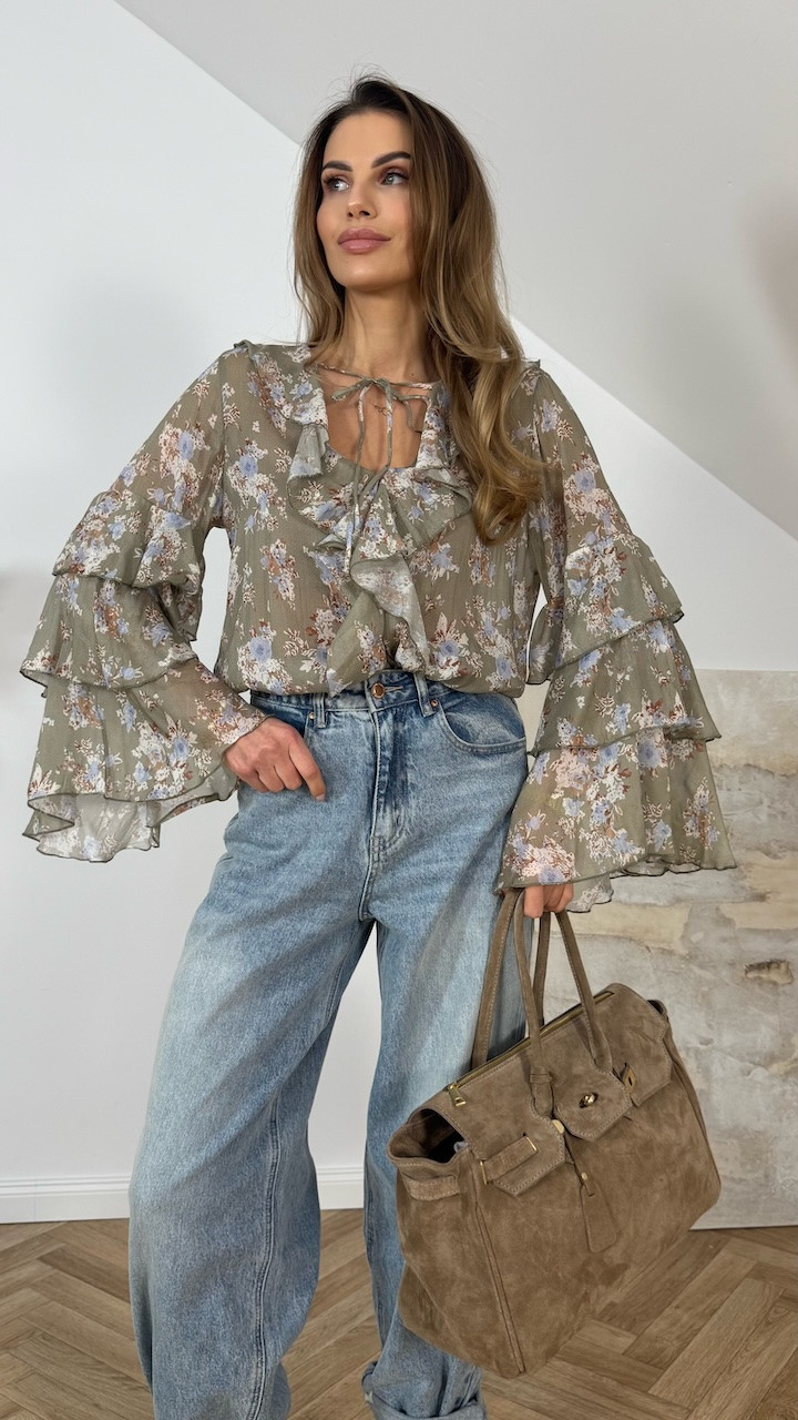 Koszula z szerokim rękawem OFELIA szałwiowa w kwiaty