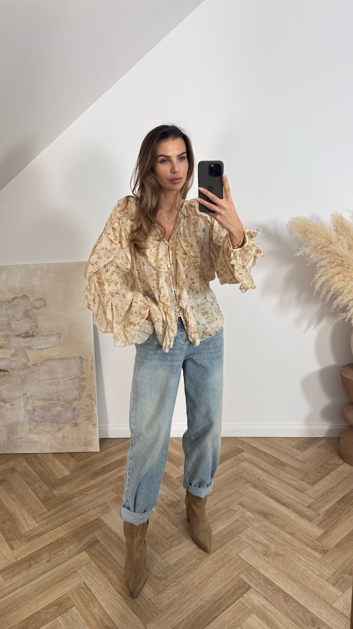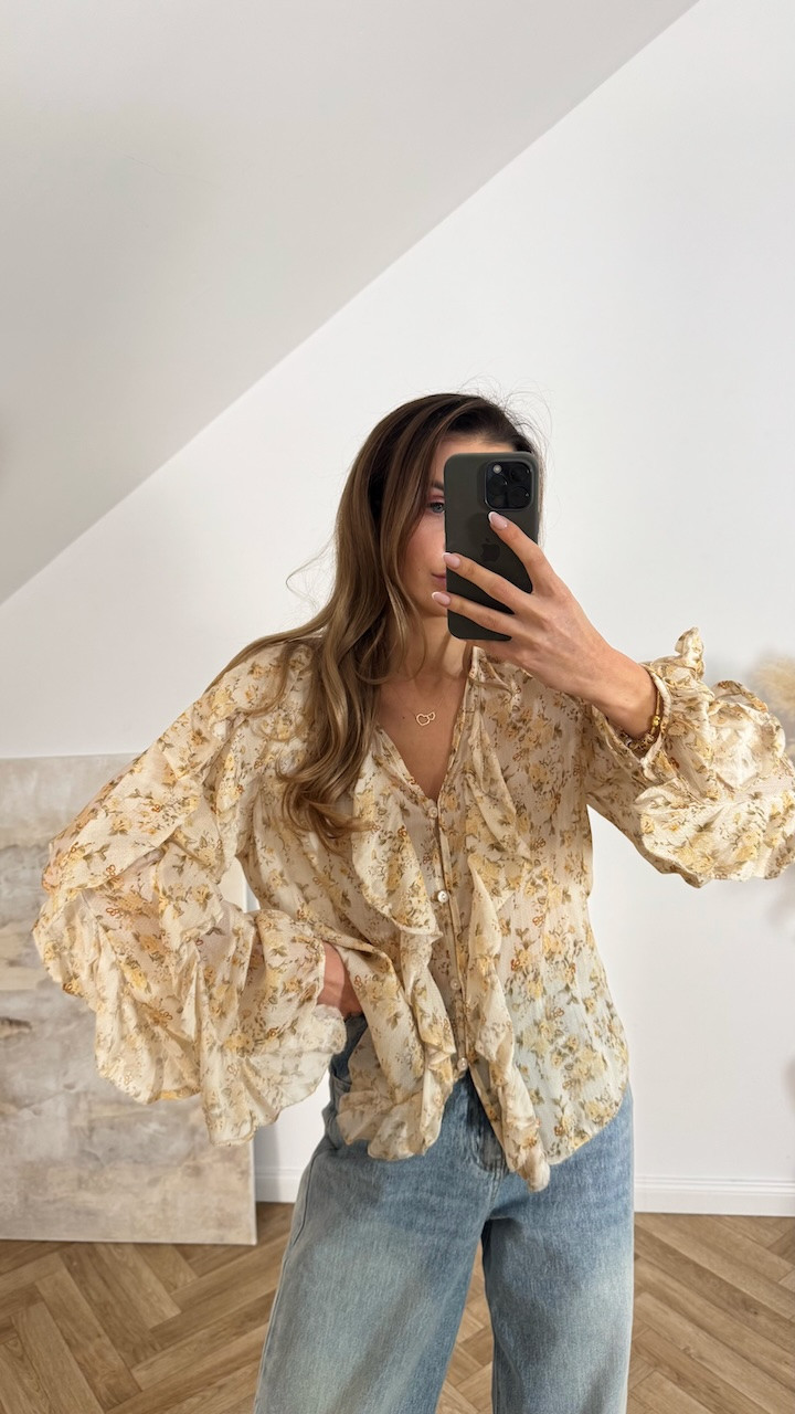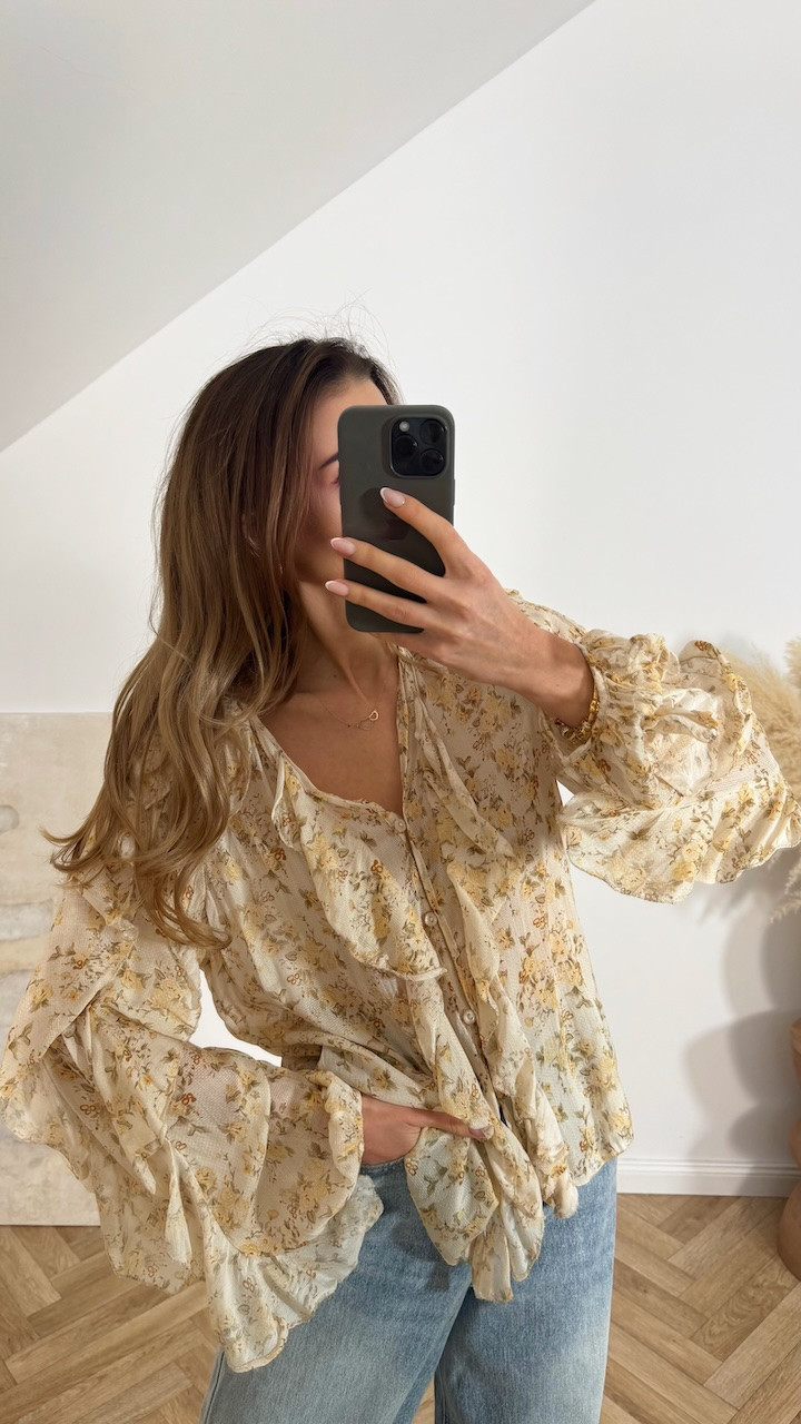 Model posiada dekolt w kształcie V, który subtelnie podkreśla szyję i dekolt. Długie, bufiasty rękawy zakończone guziczkiem nadają koszuli lekkości, a ozdobne falbanki biegnące przez całą długość rękawów przyciągają uwagę i dodają całości wyjątkowego charakteru. Dodatkowe dwie falbanki poprowadzone wzdłuż guzików na przodzie podkreślają romantyczny styl modelu.