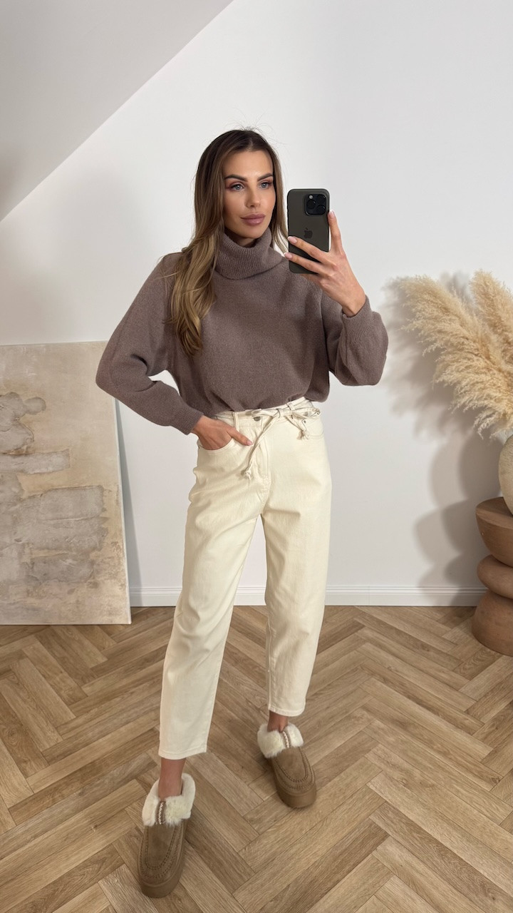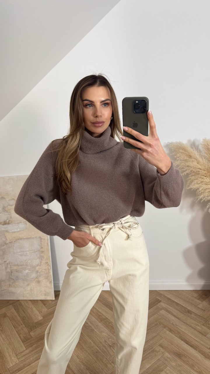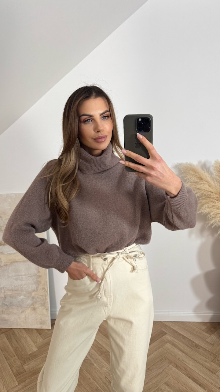 Model posiada delikatny, nieprzylegający mocno do szyi golfik, który subtelnie otula, nie powodując uczucia ucisku. Lekko szerokie rękawy zwężane ku dołowi i zakończone ściągaczami nadają sweterkowi nowoczesnego charakteru. Dodatkowy ściągacz na dole sprawia, że całość ładnie układa się na sylwetce.