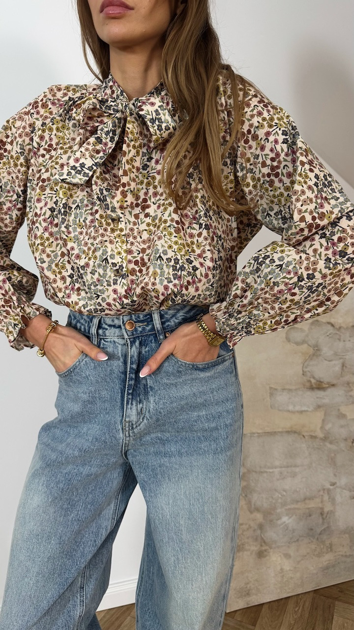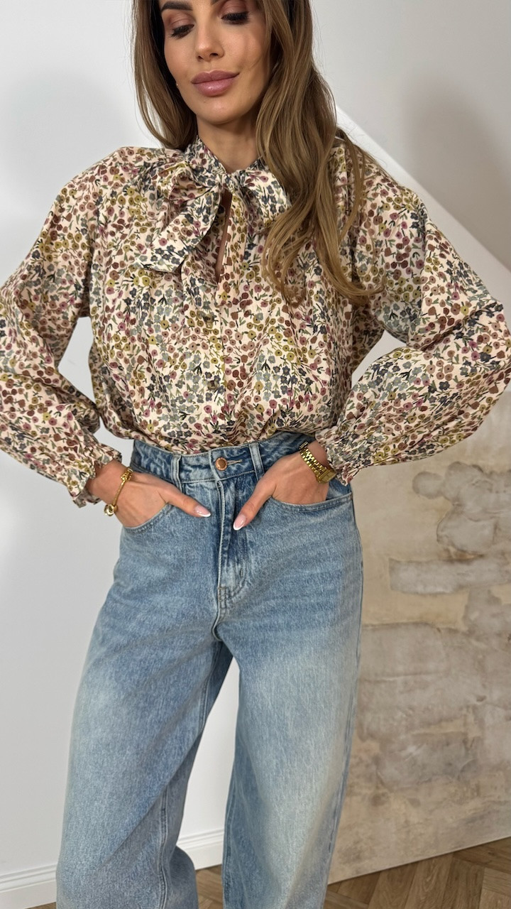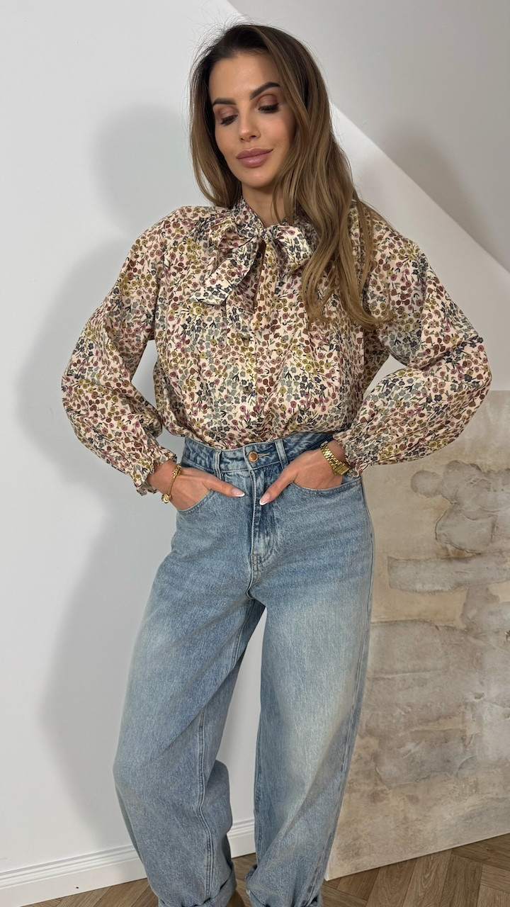 Model posiada wiązanie przy szyi oraz zapięcie na guziczki na całej długości. Bufiaste rękawy zakończone gumeczką nadają koszuli lekkości i subtelnie romantycznego charakteru. Tkanina zdobiona jest drobnymi, malowanymi kwiatkami w kolorach ziemi, co nadaje całości naturalny, ciepły i bardzo kobiecy wygląd.