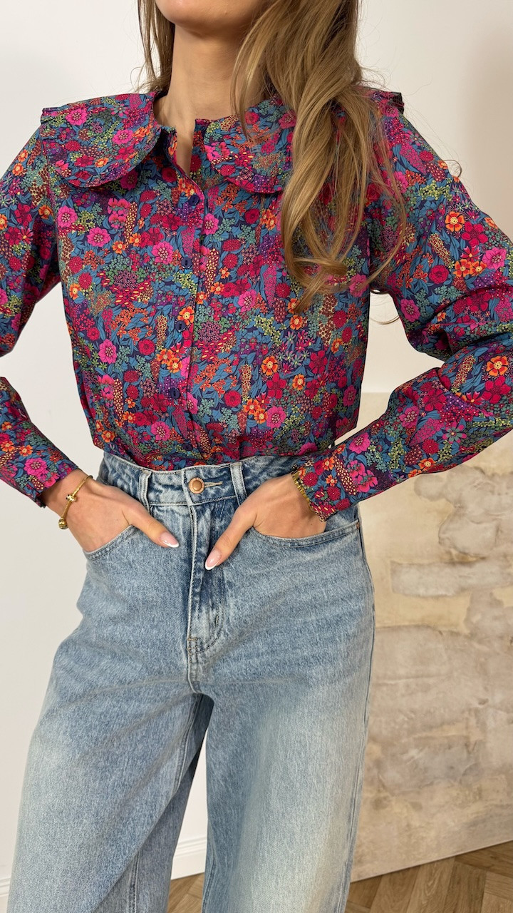 Model występuje w wersji z granatowym tłem, ozdobionym bardzo żywymi, kolorowymi kwiatami w odcieniach czerwieni, różu, fioletu, niebieskiego oraz pomarańczu. Taki print sprawia, że koszula przyciąga wzrok i stanowi mocny, stylowy akcent każdej stylizacji.