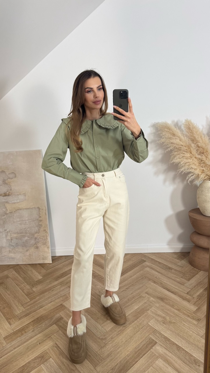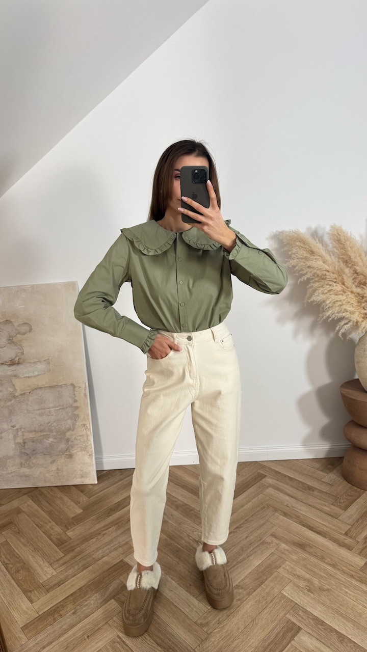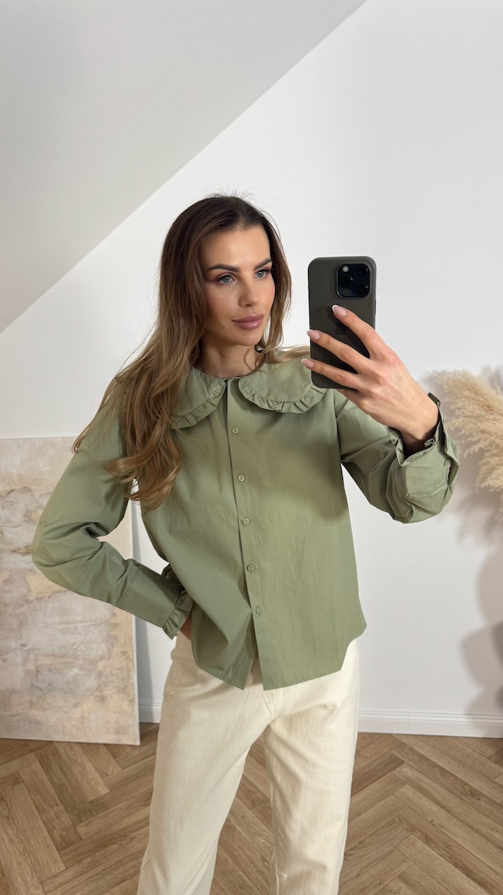 Model zapinany jest na guziki na całej długości i posiada klasyczny kołnierz, który podkreśla jej vintage’owy charakter. Długie rękawy zakończone mankietem nadają całości schludnego, eleganckiego wykończenia i pozwalają na wygodne dopasowanie.