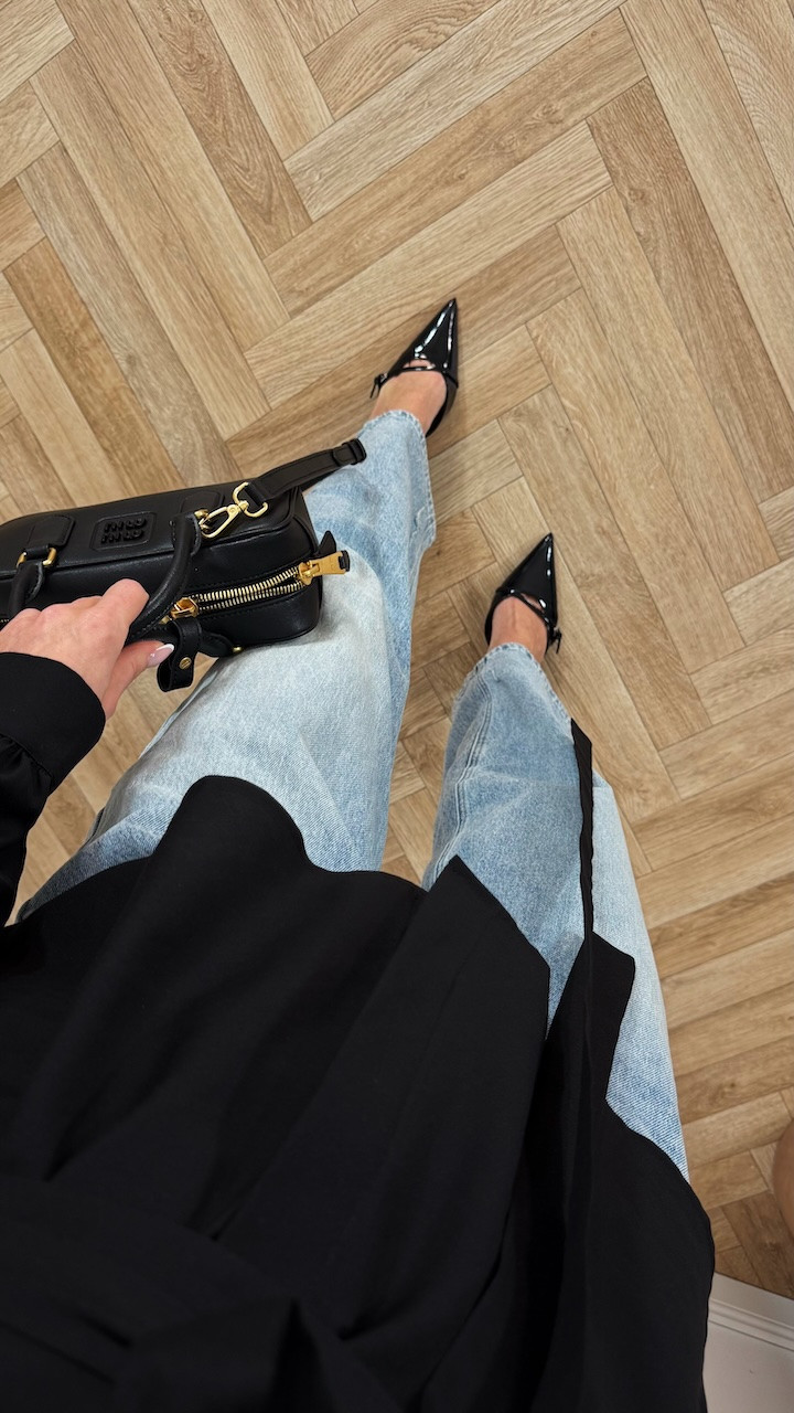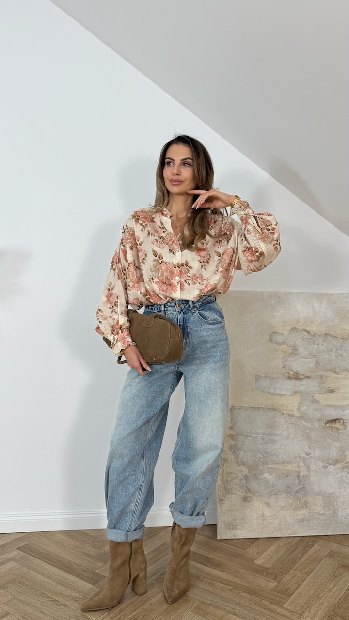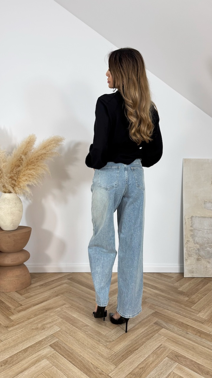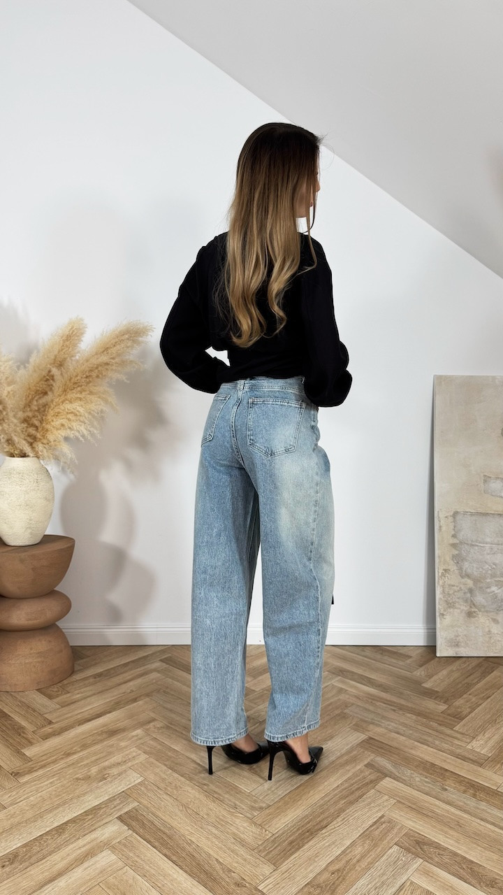 Nogawka jest szeroka, bardzo delikatnie zwężana ku dołowi, co nadaje spodniom nowoczesnego, elegancko-casualowego charakteru. Dodatkowym detalem są subtelne przetarcia na dole nogawek, które dodają lekkości i modowego luzu.