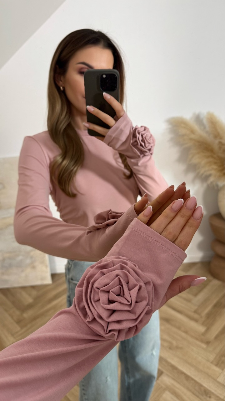 Bluzka BASIC z kwiatami na rękawach pudrowy róż
