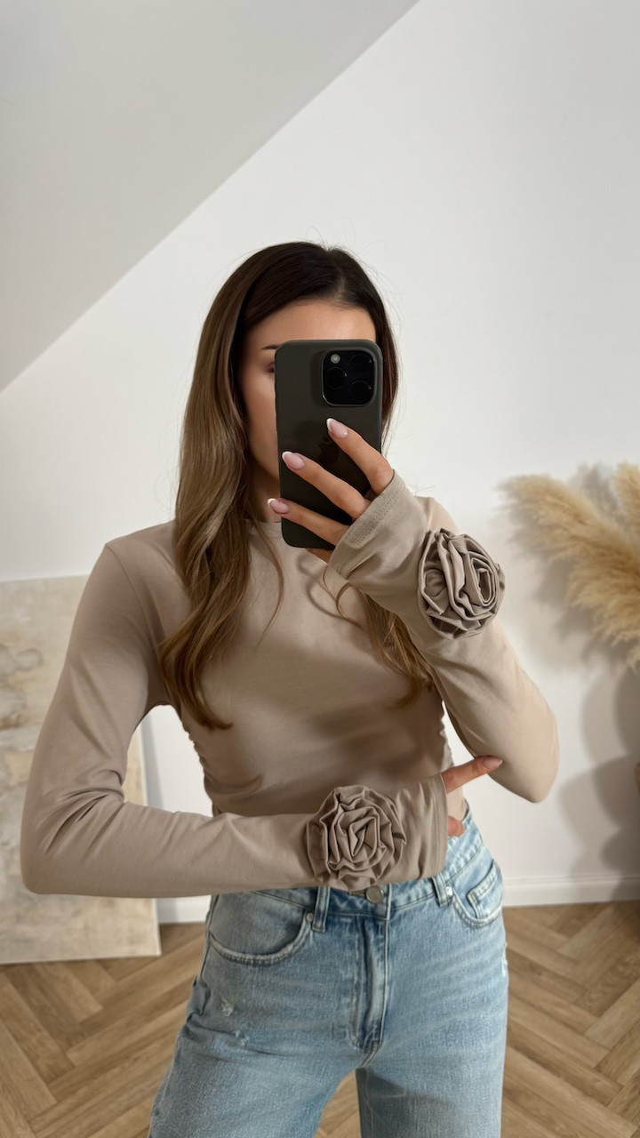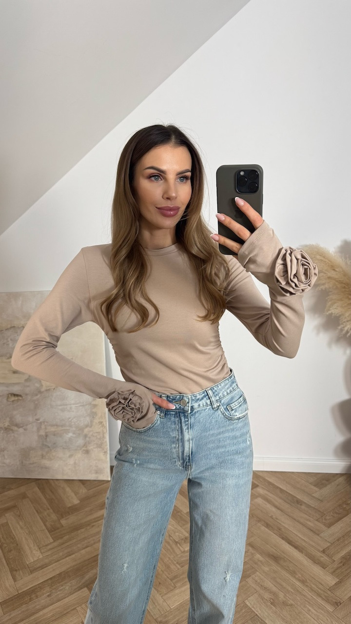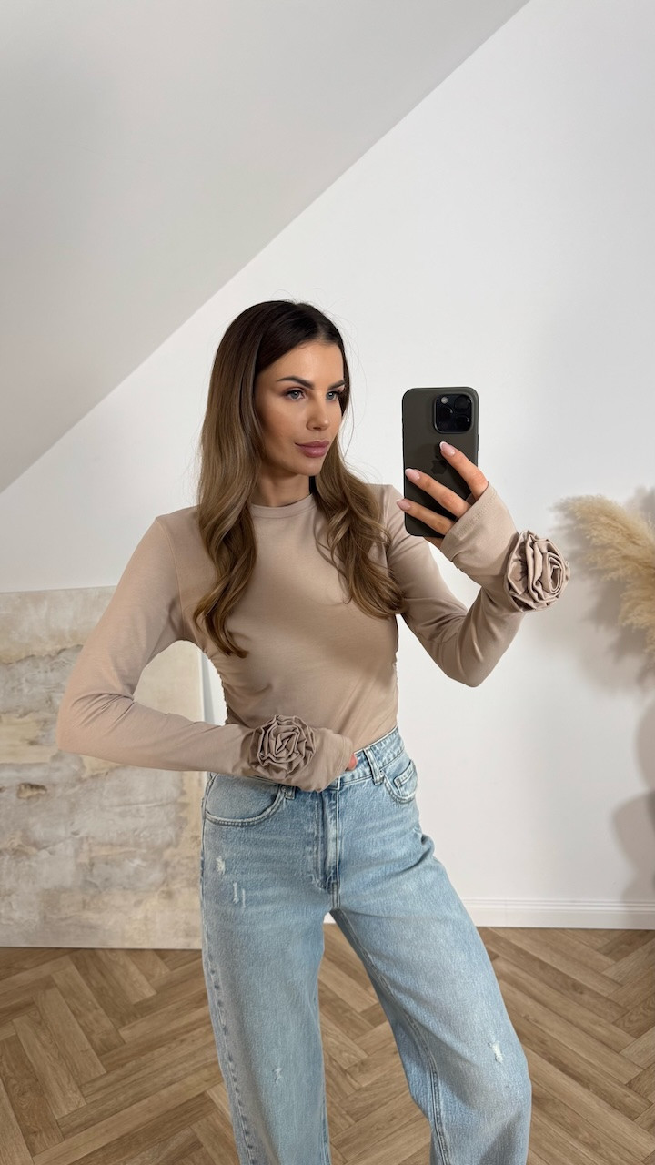 Bluzka BASIC z kwiatami na rękawach beżowa