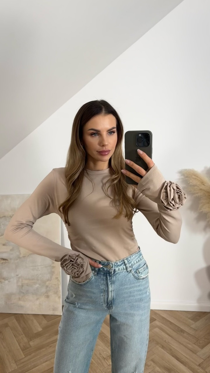 Model ma długi rękaw, a na jednym z nich umieszczony jest ozdobny kwiat 3D, stanowiący efektowny, wyróżniający detal — dzięki niemu bluzka, mimo prostoty, nabiera eleganckiego charakteru i świetnie sprawdza się zarówno na co dzień, jak i w bardziej dopracowanych stylizacjach.