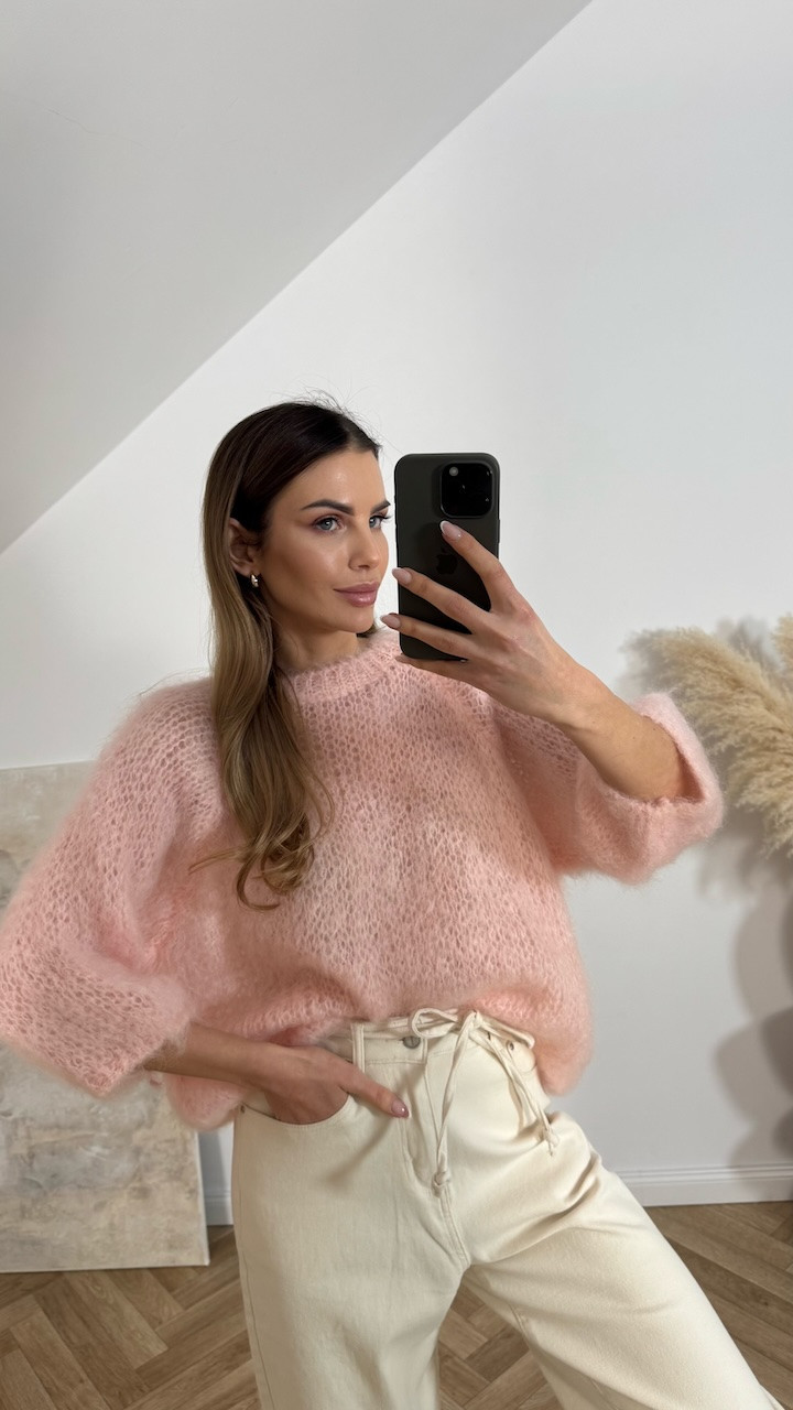 Miękki i wyjątkowo przyjemny w dotyku sweterek z dodatkiem Kid Mohairu, o klasycznym, okrągłym dekolcie. Model posiada rękaw sięgający do łokcia, o delikatnie bufiastej formie, który nadaje całości lekkości i bardzo kobiecego charakteru. Sweterek nie jest prążkowany, ma gładką, puszystą strukturę, która pięknie się układa i wygląda niezwykle elegancko.