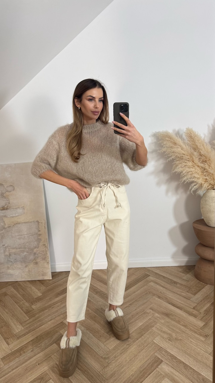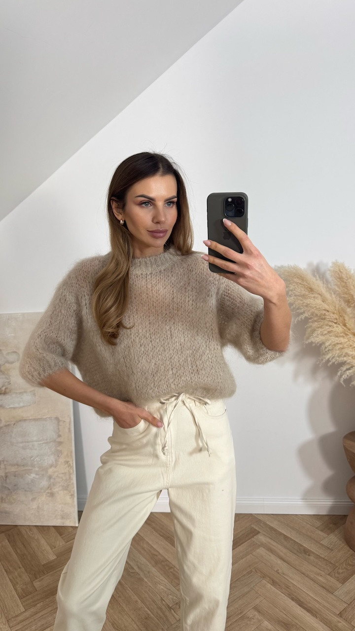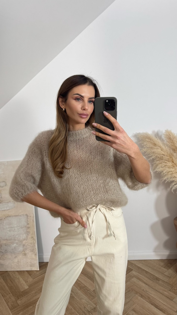 Miękki i wyjątkowo przyjemny w dotyku sweterek z dodatkiem Kid Mohairu, o klasycznym, okrągłym dekolcie. Model posiada rękaw sięgający do łokcia, o delikatnie bufiastej formie, który nadaje całości lekkości i bardzo kobiecego charakteru. Sweterek nie jest prążkowany, ma gładką, puszystą strukturę, która pięknie się układa i wygląda niezwykle elegancko.