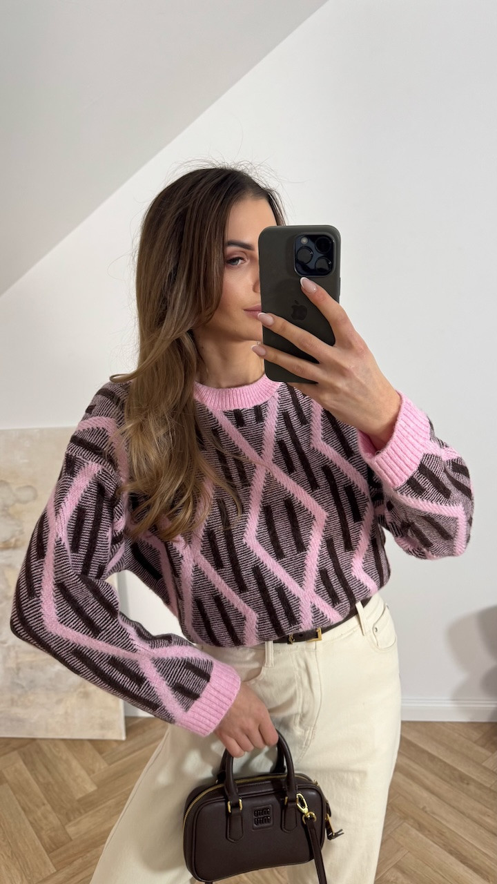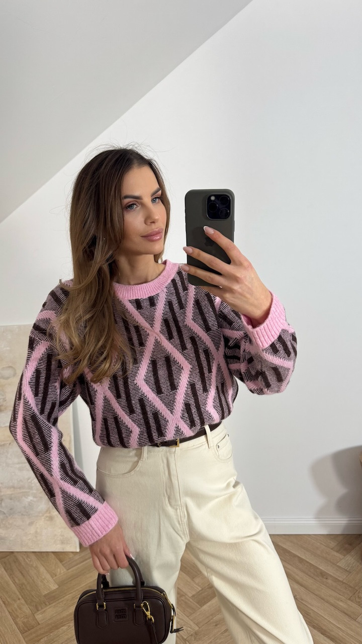 Sweter w czekoladowo różowe romby