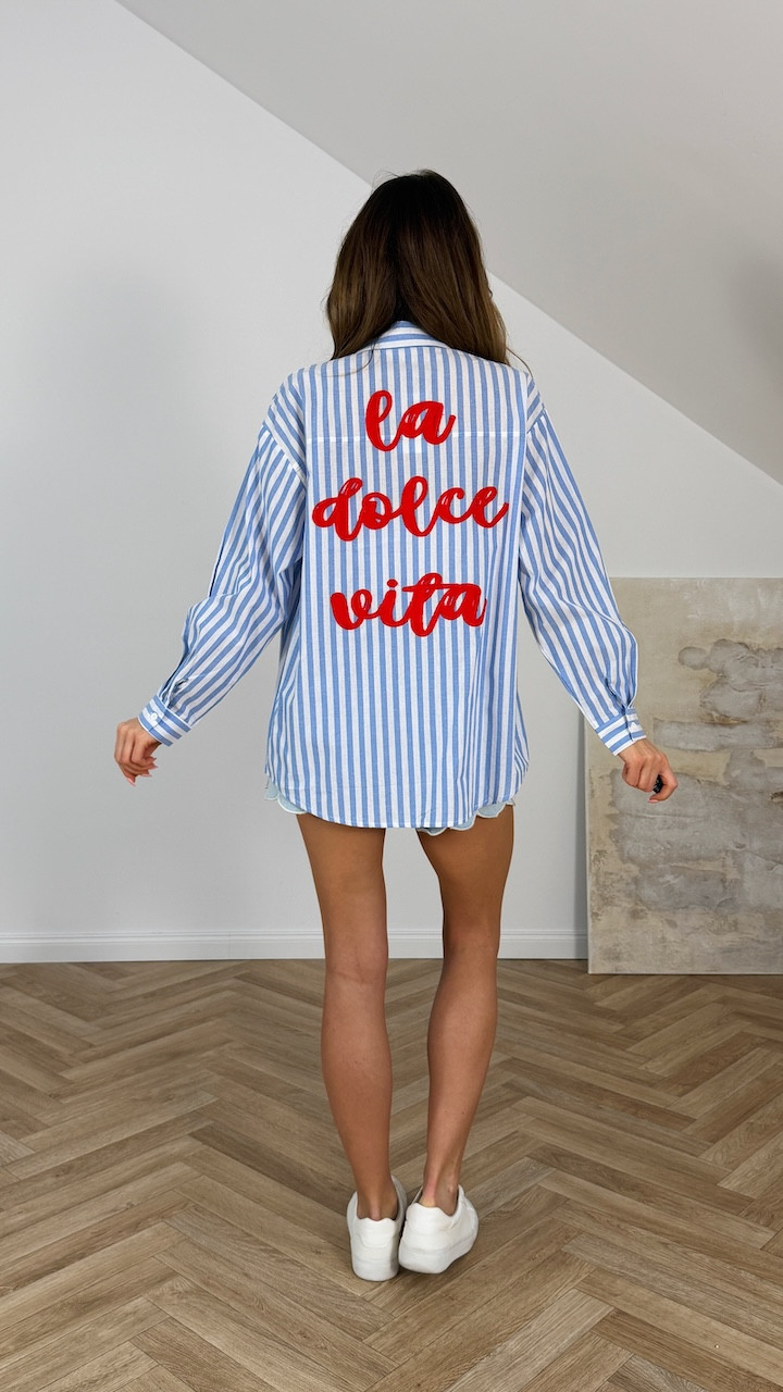 Klasyczna koszula w paski o ponadczasowym kroju, która łączy elegancję z modnym, wyróżniającym się akcentem. Model zapinany jest po całości na guziki i posiada tradycyjny kołnierzyk, dzięki czemu doskonale sprawdzi się zarówno w codziennych, jak i bardziej eleganckich stylizacjach. Na plecach znajduje się efektowny, wyszywany napis „La Dolce Vita”, który nadaje koszuli wyjątkowego charakteru i przyciąga uwagę.