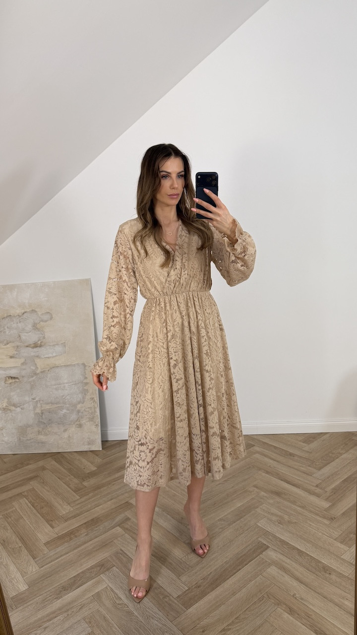 Rękawy są transparentne, wykonane z delikatnej koronki, zakończone gumeczką oraz falbanką, co dodaje romantycznego akcentu. Dół sukienki jest lekko puszczony, swobodnie układa się w ruchu i nadaje sylwetce lekkości.