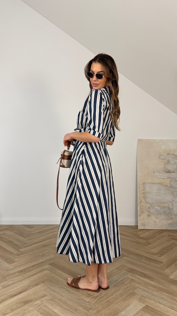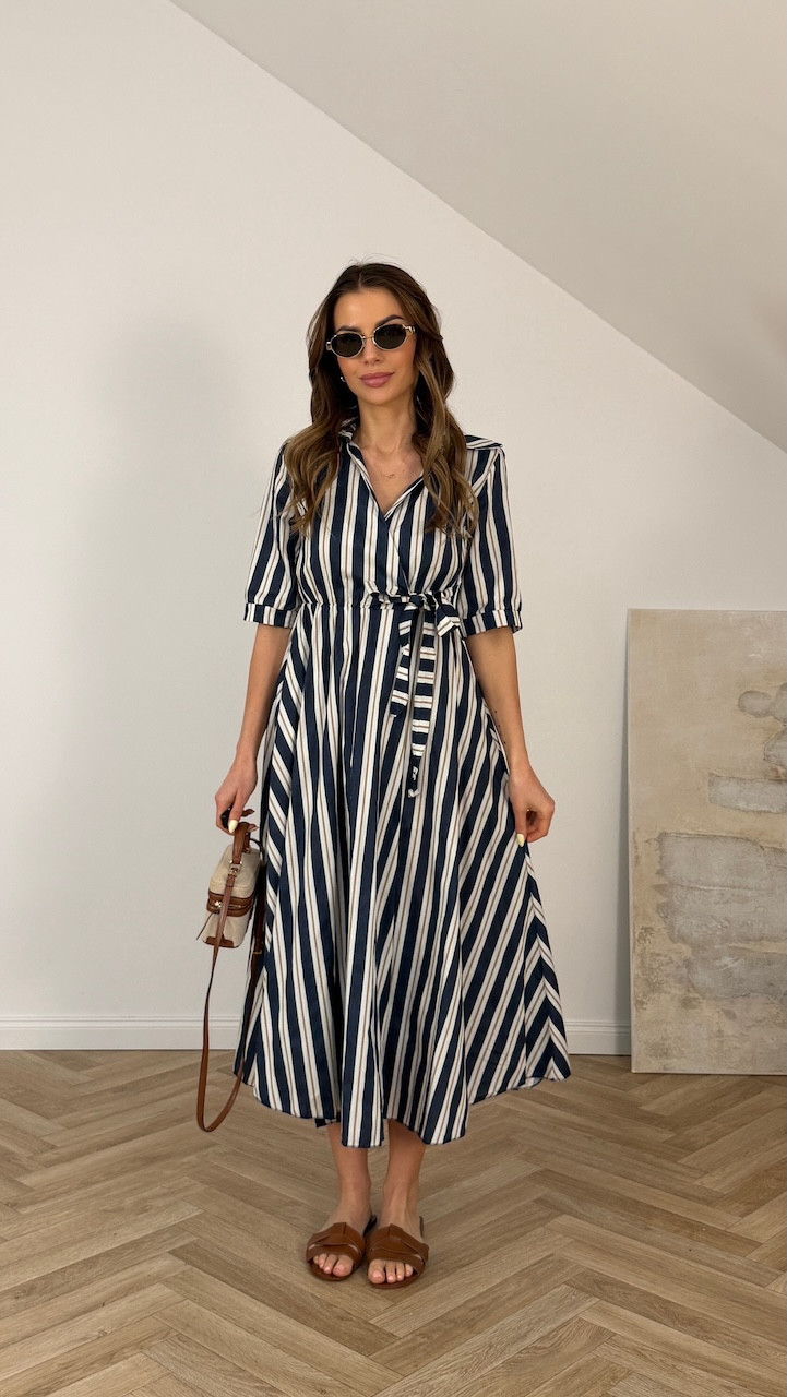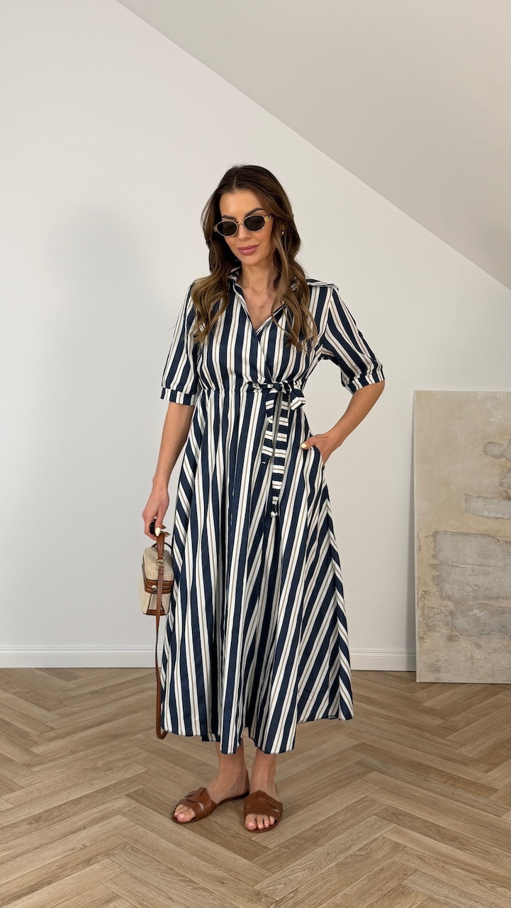 Sukienka z wiązaniem MARELLA granatowo beżowe i białe paski