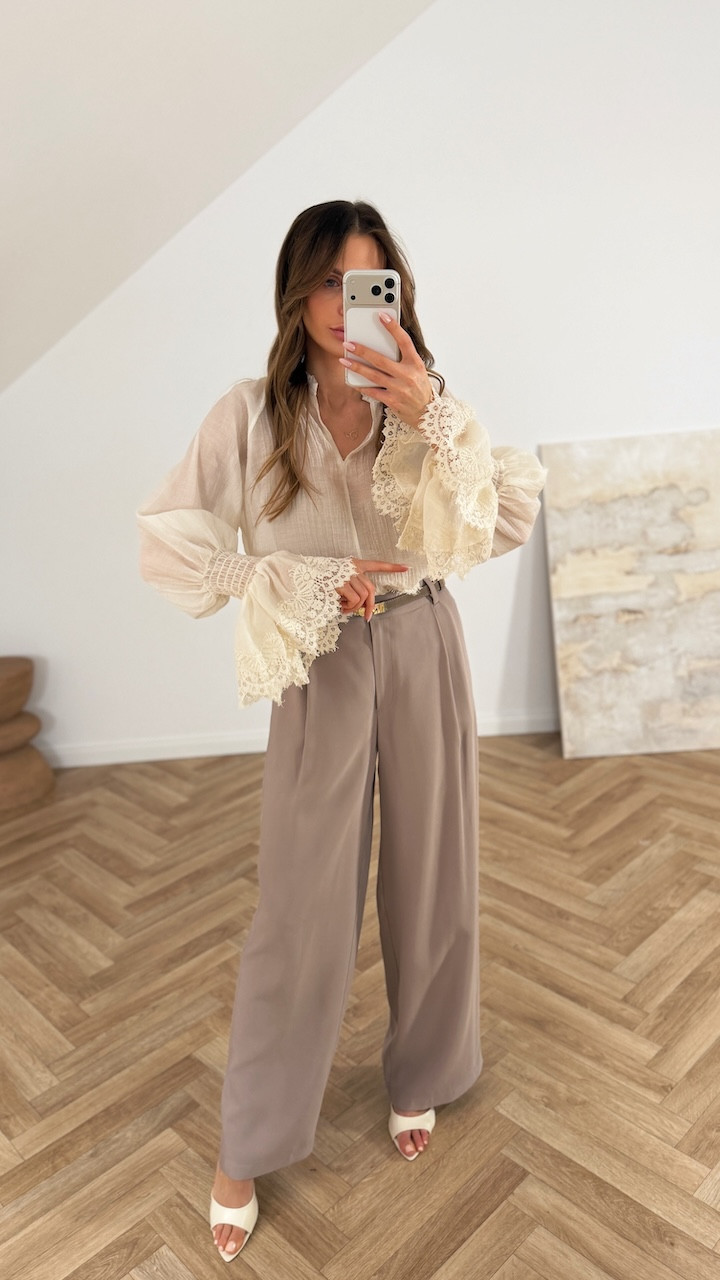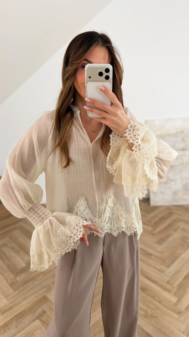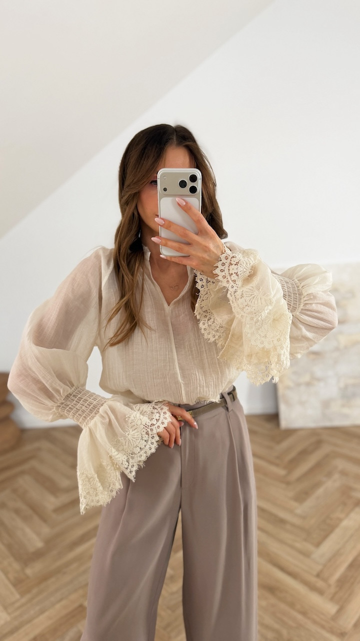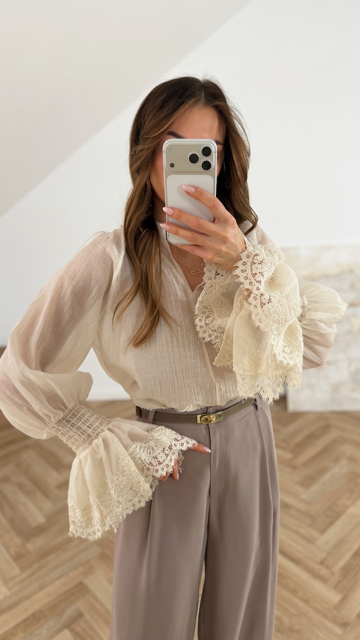 Stylowa koszula o eleganckim charakterze to idealna propozycja do kobiecych i wyjątkowych stylizacji. Model wyróżnia się efektownymi rękawami typu dzwonek, wykończonymi falbanką, koronką oraz delikatnym ściągaczem, co nadaje całości romantycznego charakteru.